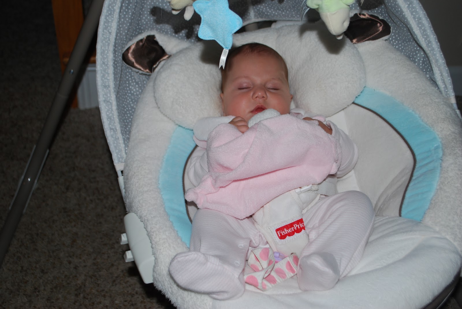 Avery is finally big enough for her Johnny Jump Up and her exersaucer. She is really enjoying these new activities, but she still has a blast on her activity mat. Mommy has to make sure she is secure in her swing and boucy seat these days because Miss things is quite the wiggle worm at times.
